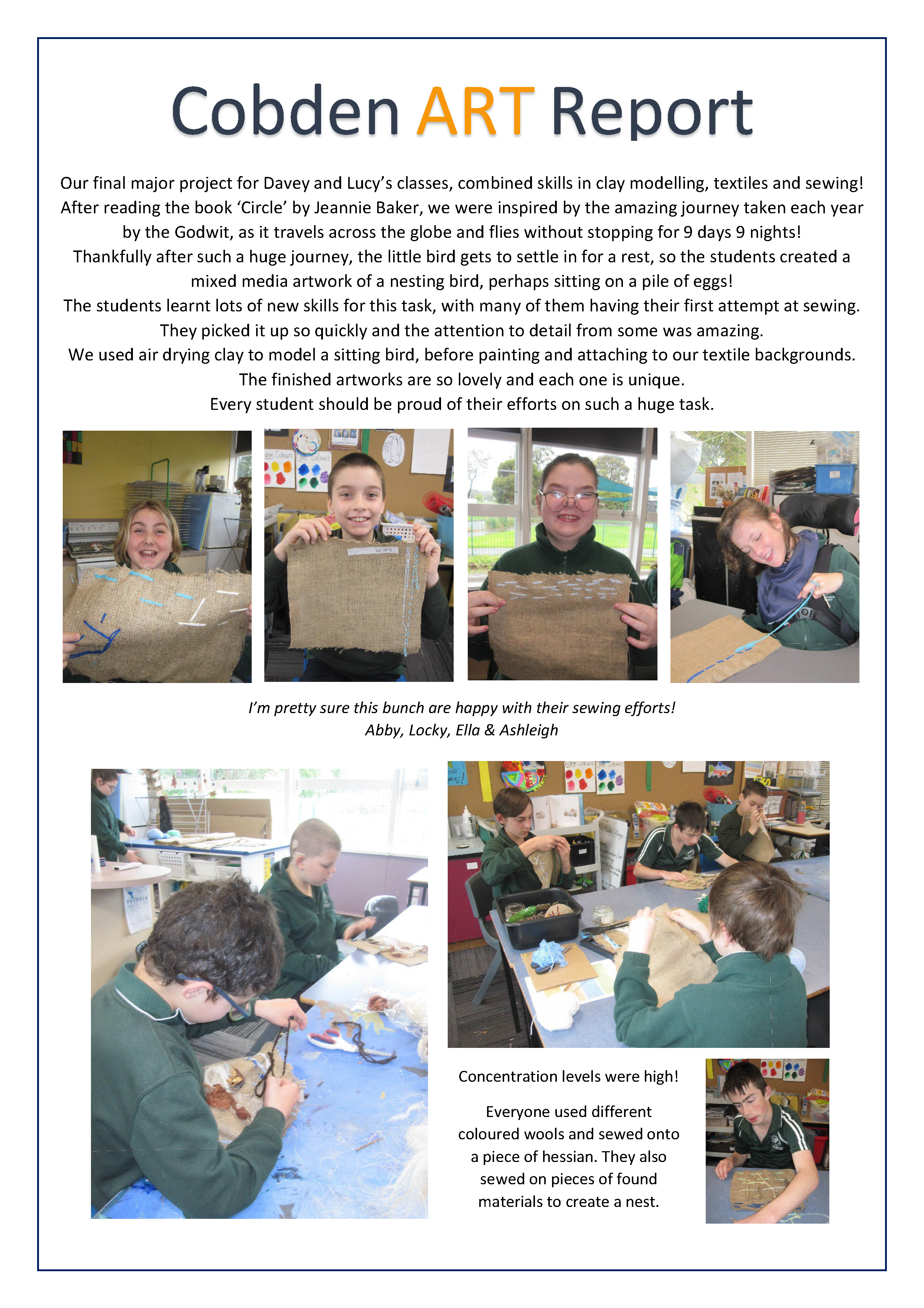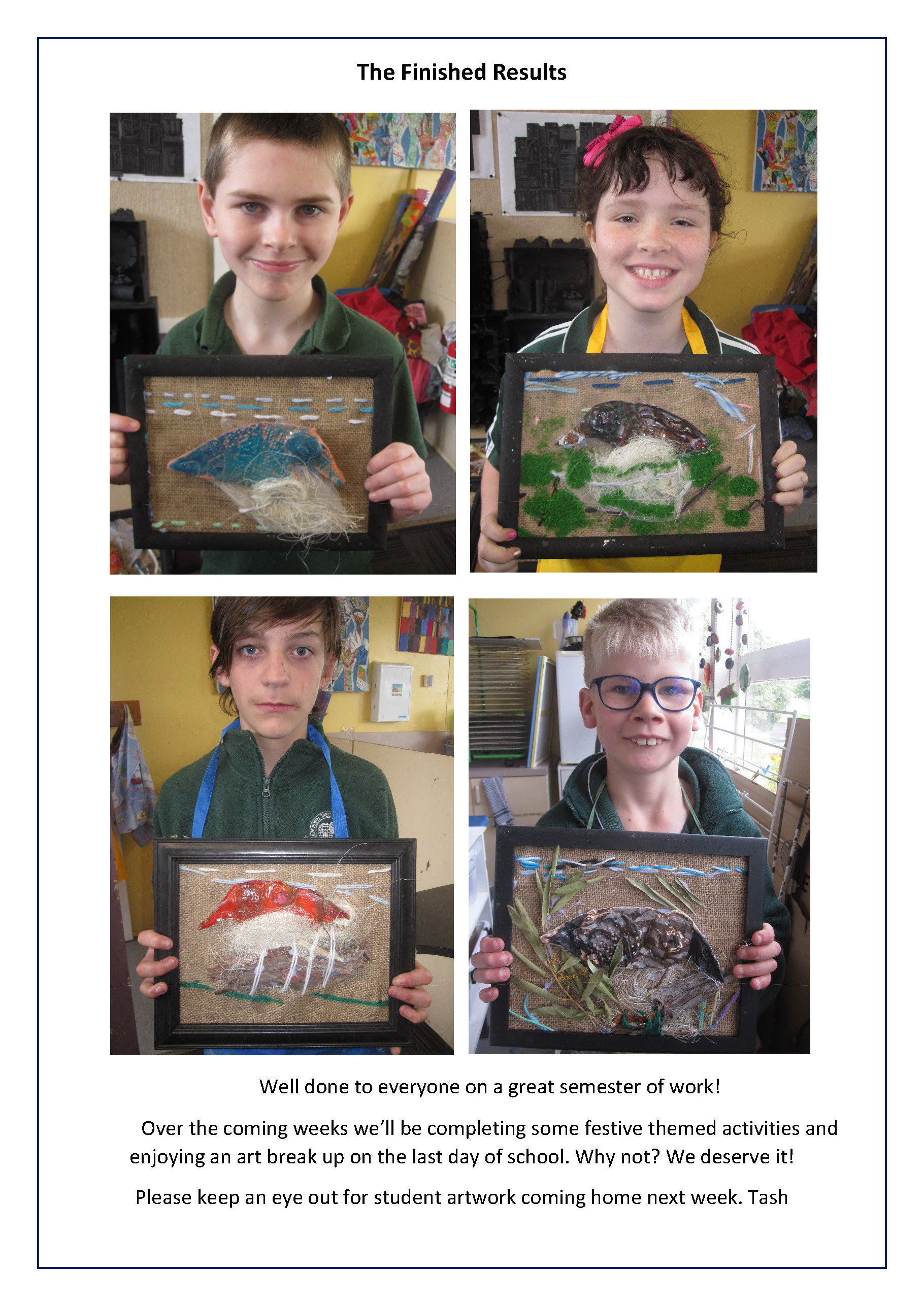 Lucy and Davey’s classes have completed their final artworks for the term, with a bird inspired ‘mixed media’ piece incorporating weaving, sewing, collage and clay. Everyone worked so hard on these pieces and the finished results clearly demonstrate their efforts!