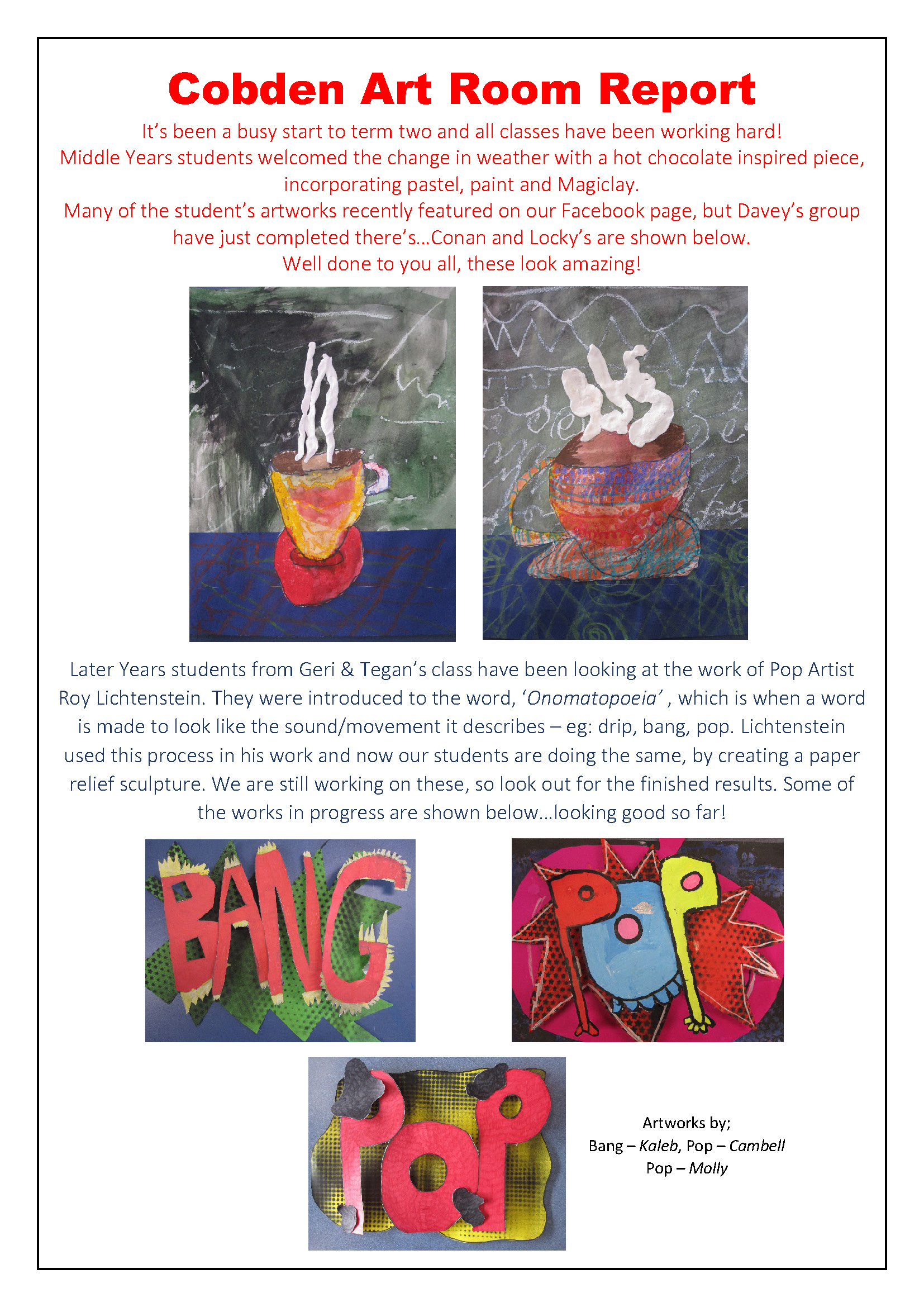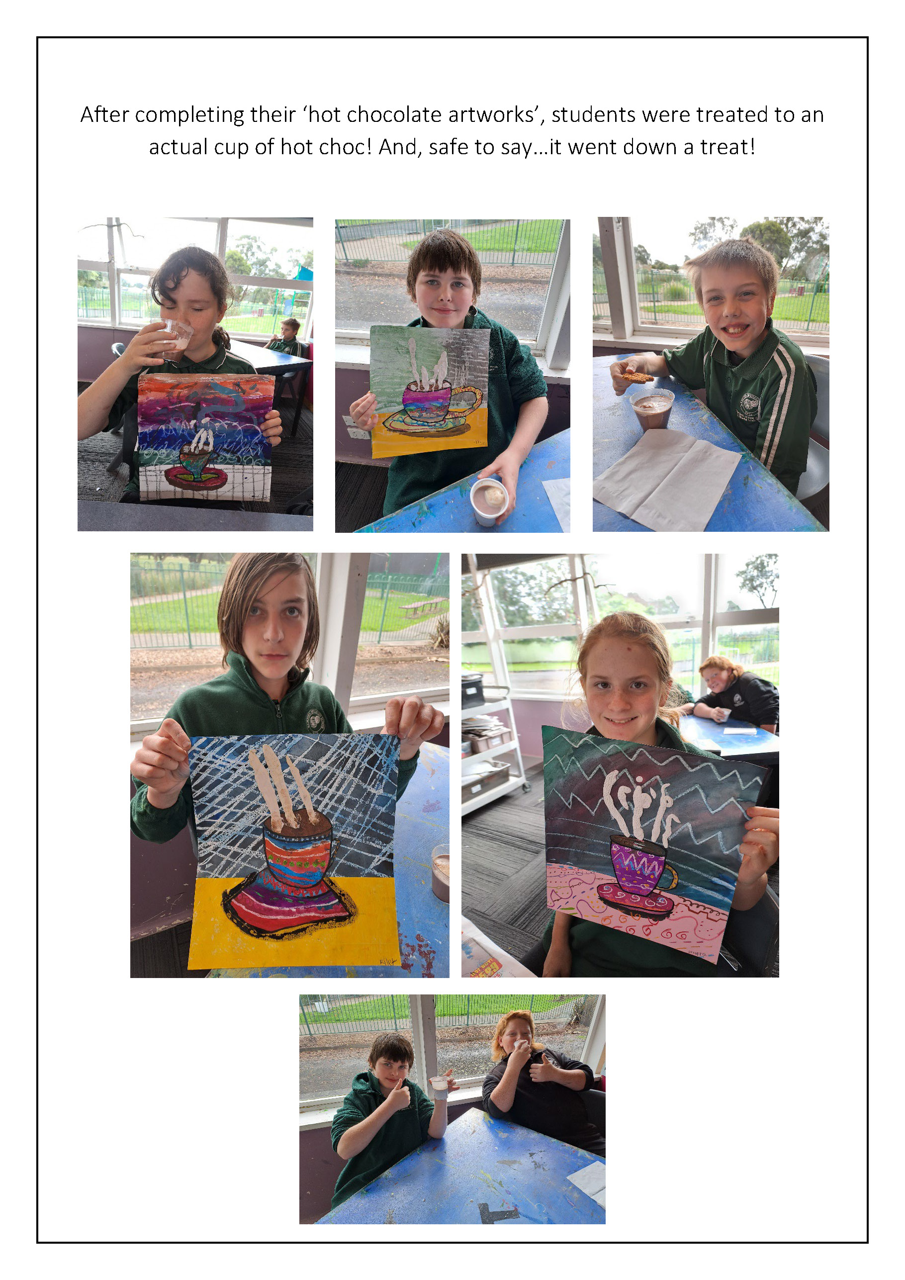 Middle Years have been working on some ‘hot chocolate’ inspired pieces and Later Years have been learning about the use of words in art, with paper relief sculptures.