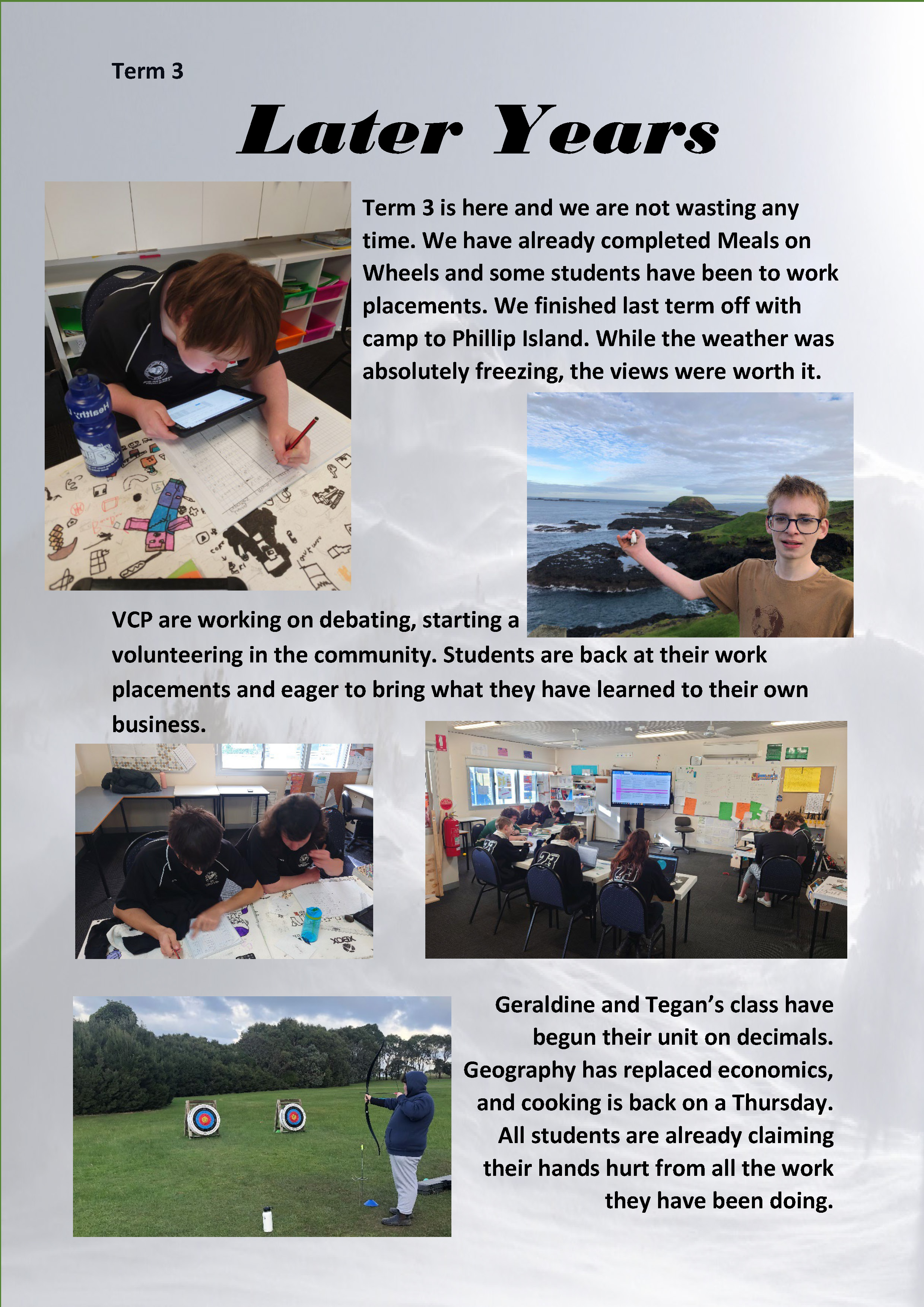 Welcome to Term 3, we are looking forward to the term ahead with lots of exciting things happening including school camps, winter sports, passport to employment and many other interesting learnings.