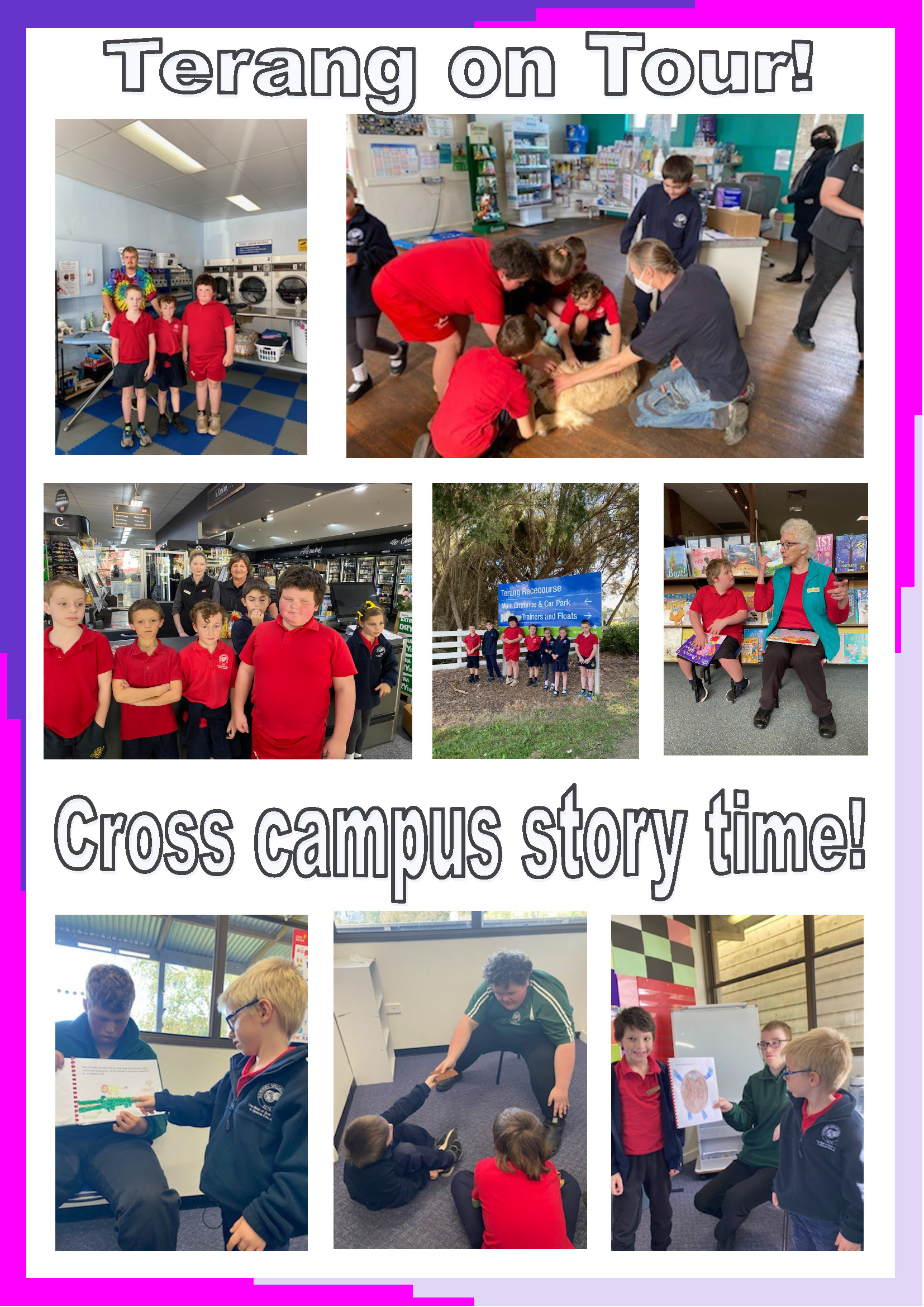 Over the past couple of weeks students Paul and Kelly’s classes have been working on creating some new books for the school library. This has included using some digital editing to create fun coded text sentences, put themselves into each story illustration, and create an expose on the happenings in Terang. All classes were also fortunate to get some inspiration from Tegan’s class, who visited us last week to read us the stories they had created, also kindly donating a copy of each to our class libraries.