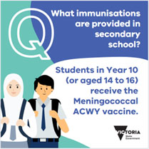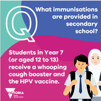Learn more about the Secondary School Immunisation Program in Victoria at: www.betterhealth.vic.gov.au/health/healthyliving/immunisation-in-secondary-schools