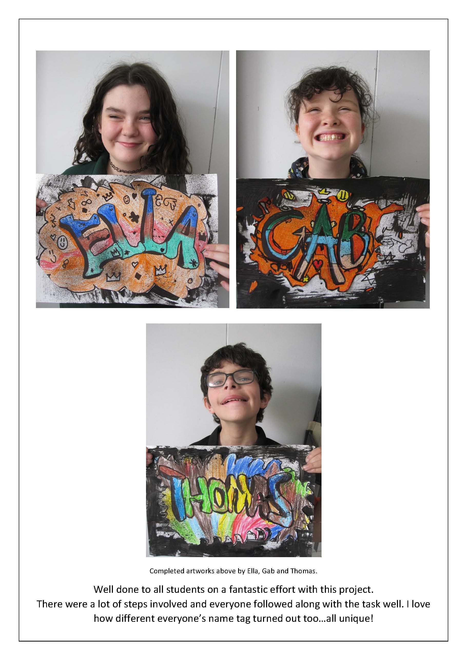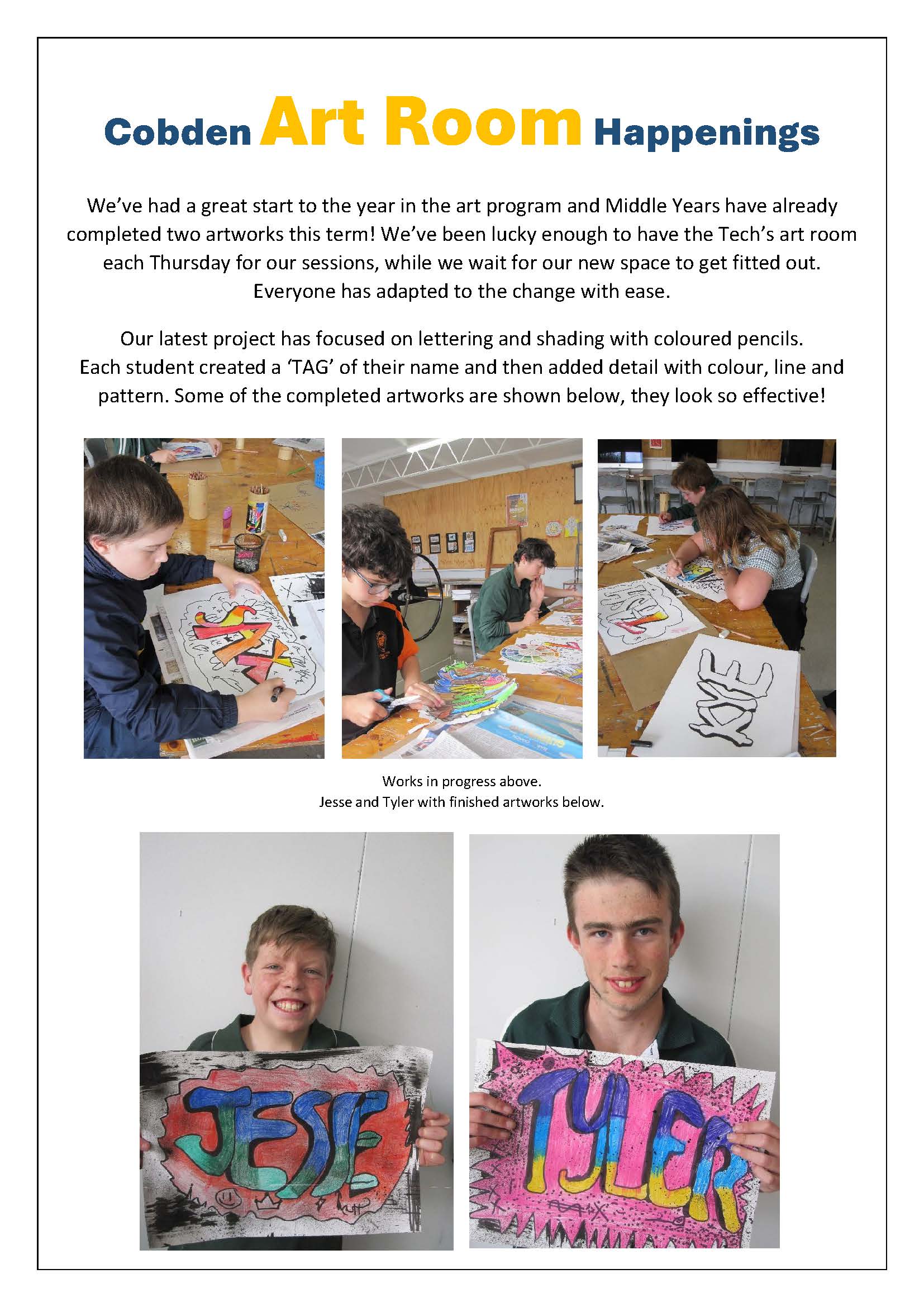 Middle Years students have had a productive start to the year in the art room…already completing two artworks! The latest was a ‘TAG’ of their name, which involved learning lettering techniques, creating a textured background and using coloured pencils for shading. They did a great job!