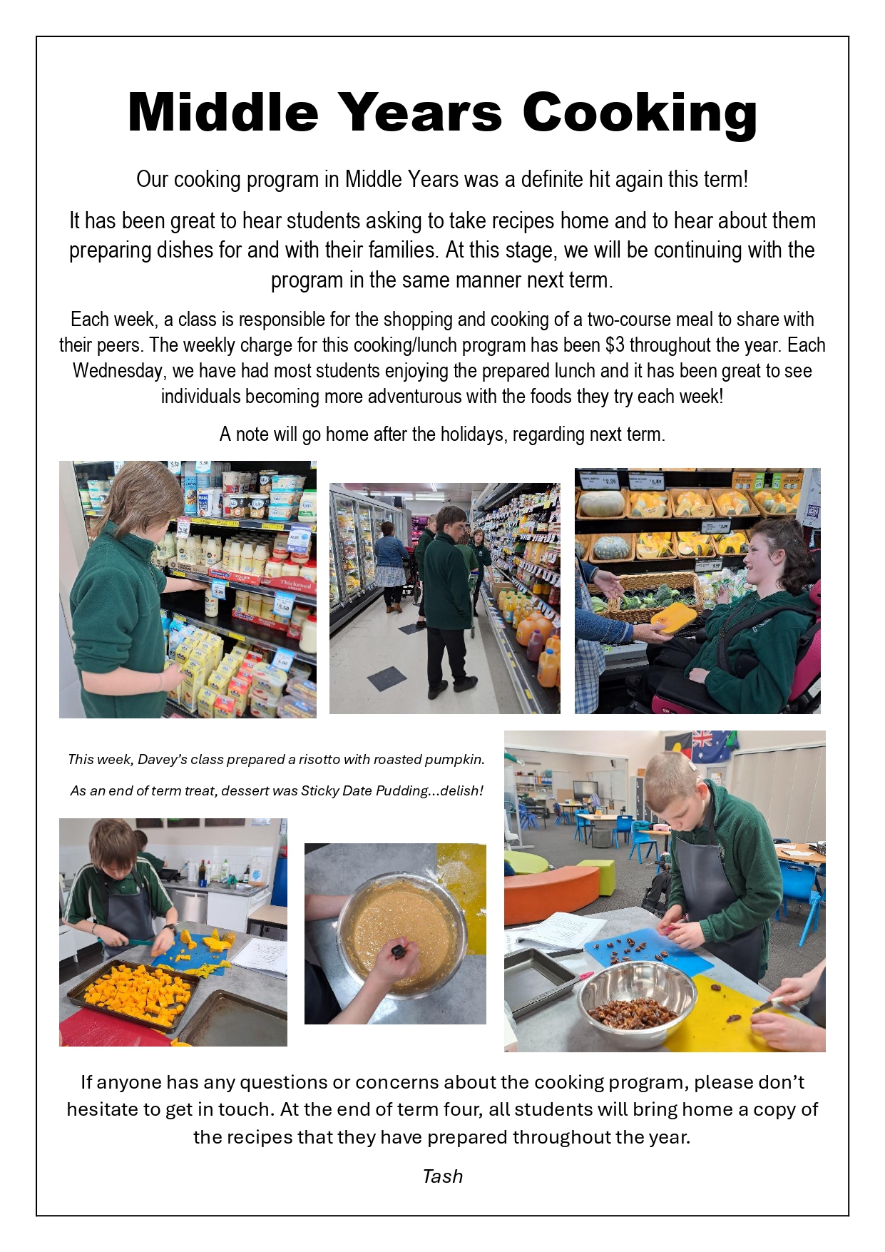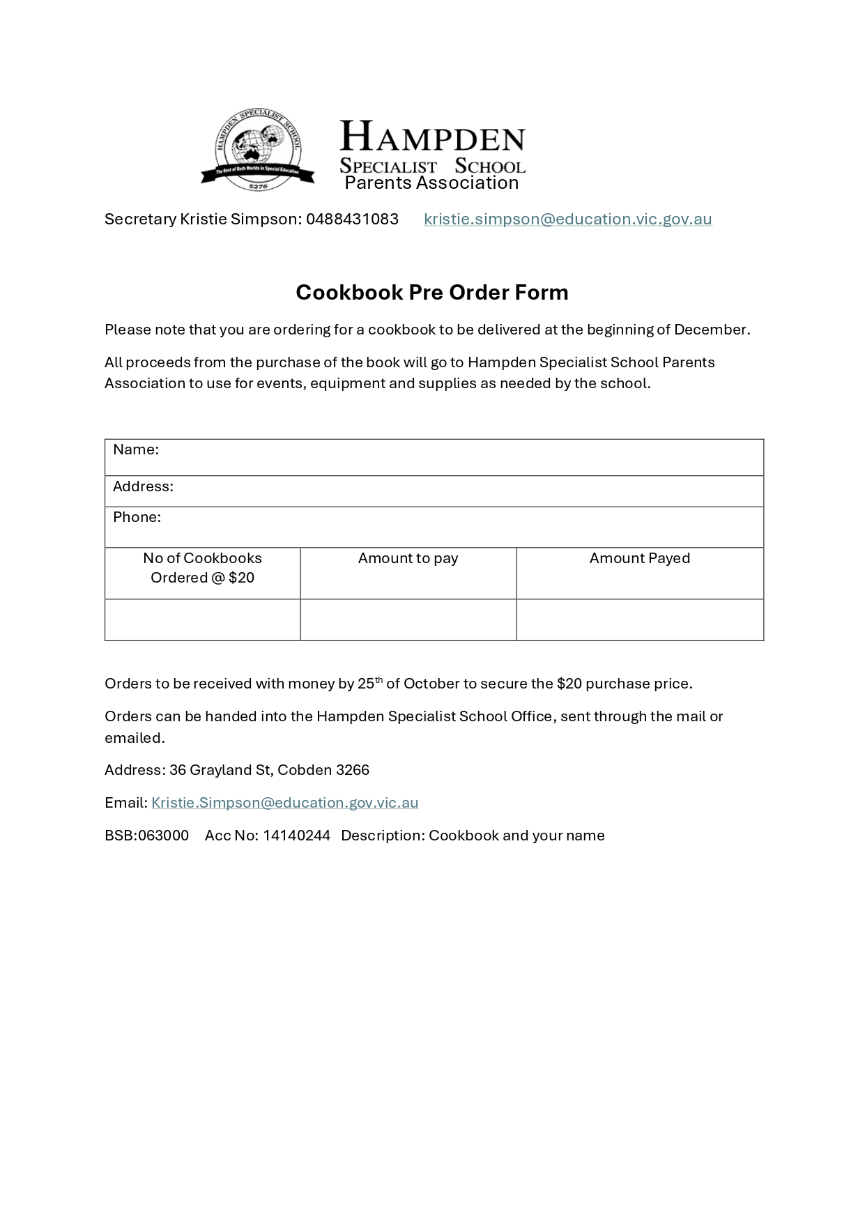 The Cooking with kids Cookbook is our next big fundraiser. Contributions are sought for recipes that are easy to make with the kids or that your kids really love. Your recipes and/or photos can be handed into front office or emailed to Kristie.simpson@education.vic.gov.au by October 15th. Cookbook image types needed to be in a JPEG or PNG file. If your not sure how to do this Kristie is available to help you. Cookbooks can be pre-ordered for $20 by November 1st or purchased for $25 in December. These are professionally printed cookbooks. The pre – order form follows this letter.