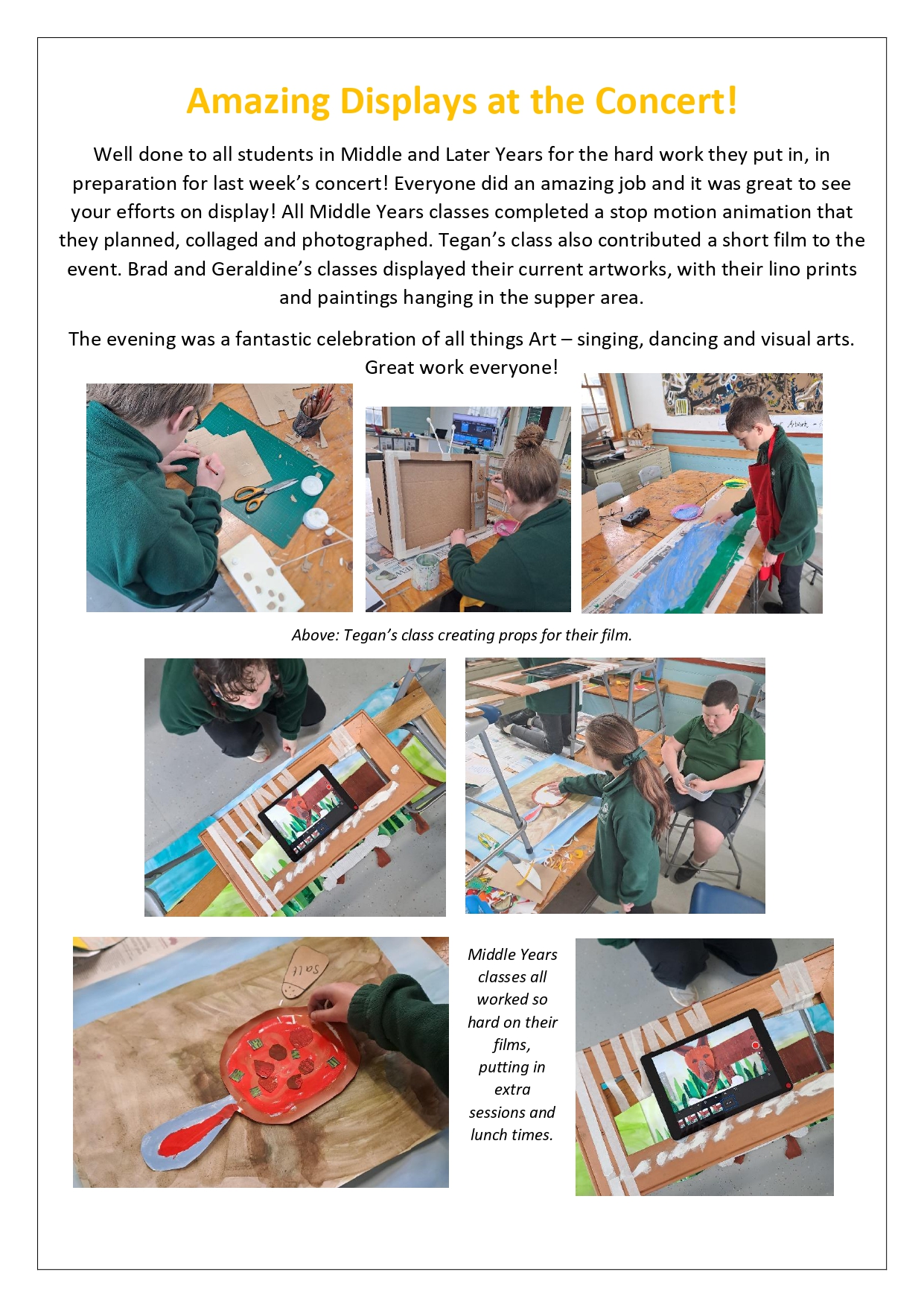 Middle and Later Years students completed animations, prints and paintings for the event. Everyone put in an amazing effort throughout the term, which was evident on the night!