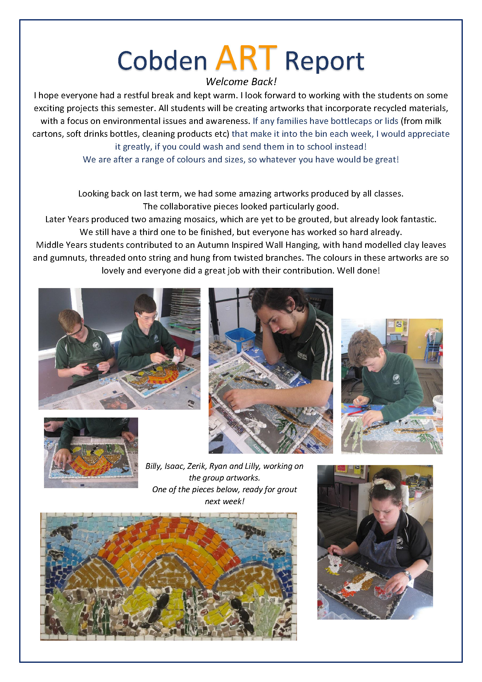 This term will be another busy one, with school camps and the winter sports program. There are still many colds/flu’s, gastro and COVID outbreaks occurring in our community, please continue to monitor your child and keep them home if they are sick.