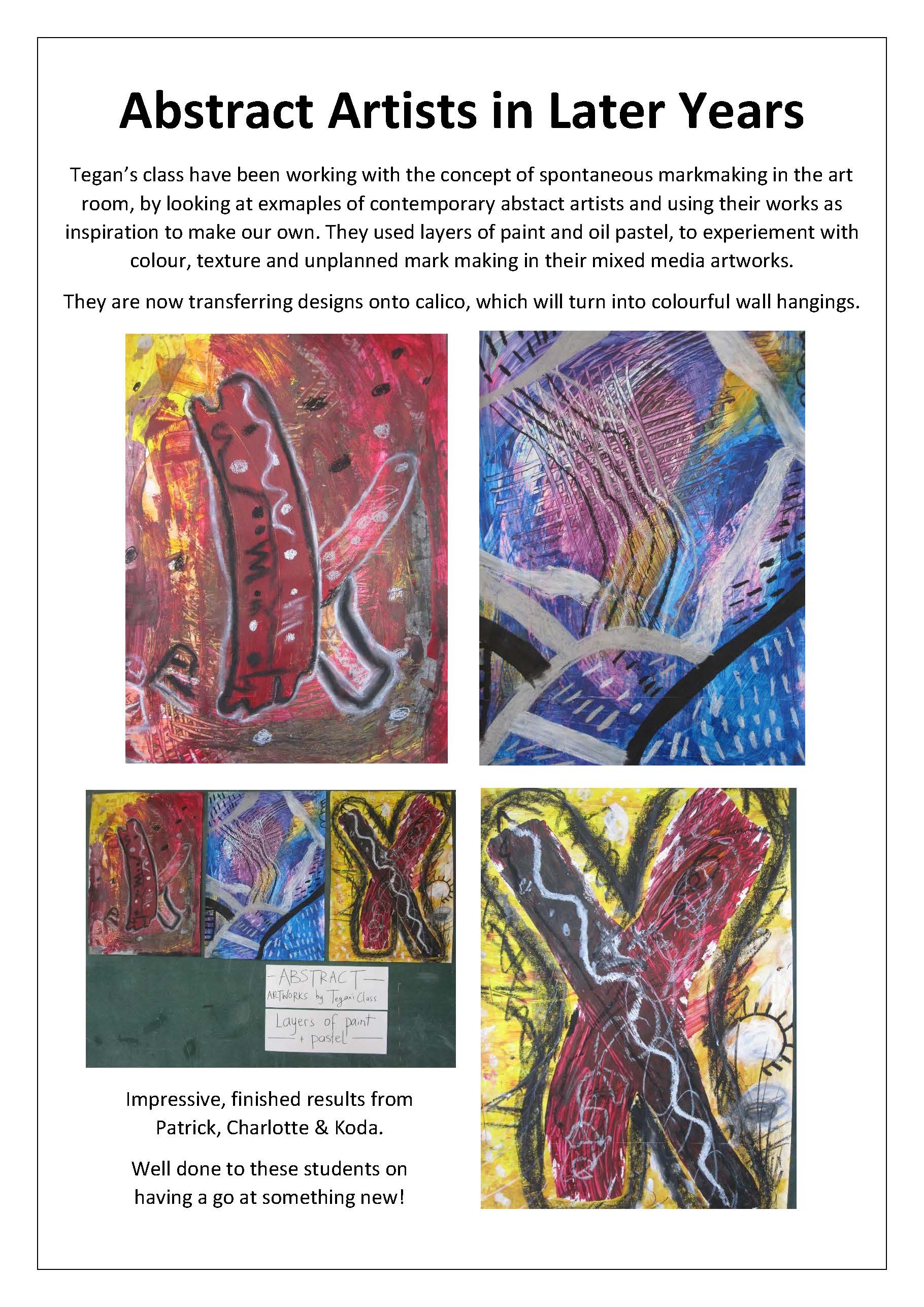 Tegan’s class have been working on abstract artworks with a variety of media, including paint, pastel and textiles. Everyone has had some impressive results so far!