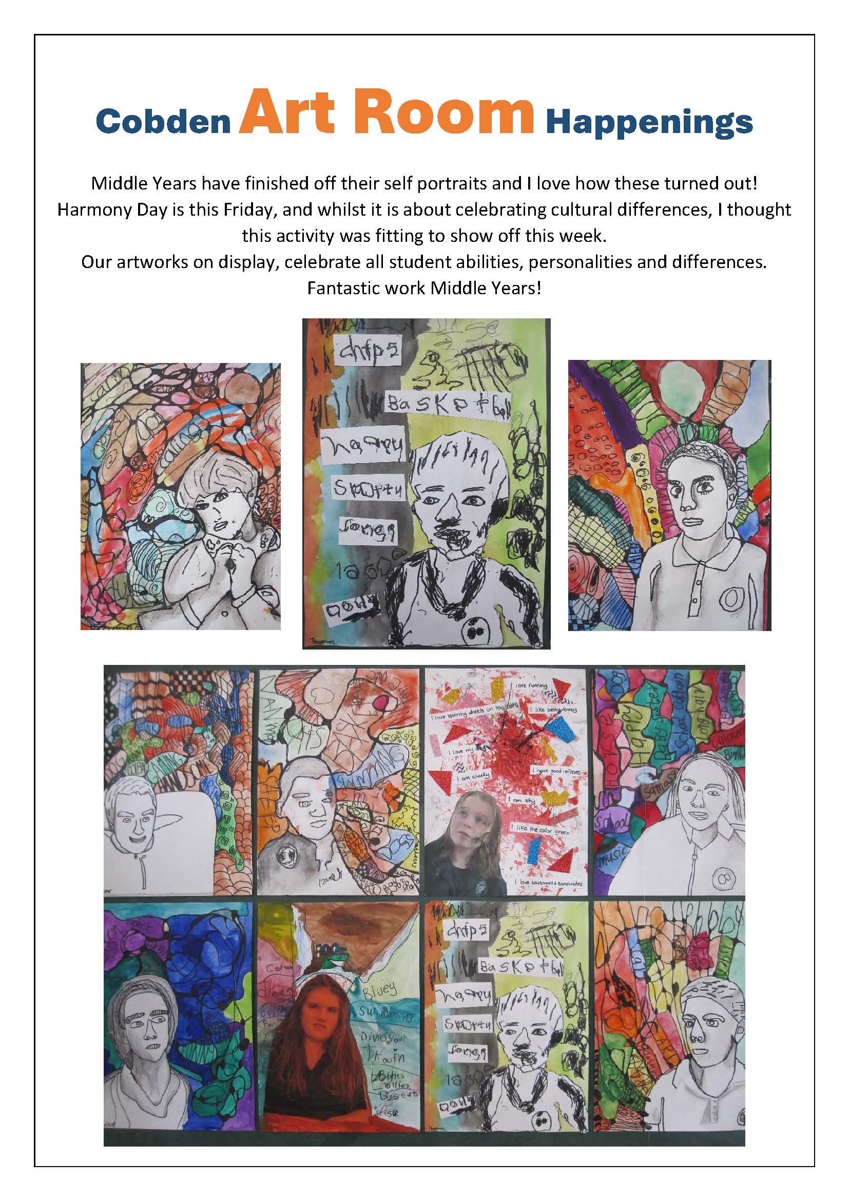Self portraits completed by Middle Years are on display in the Art Room.