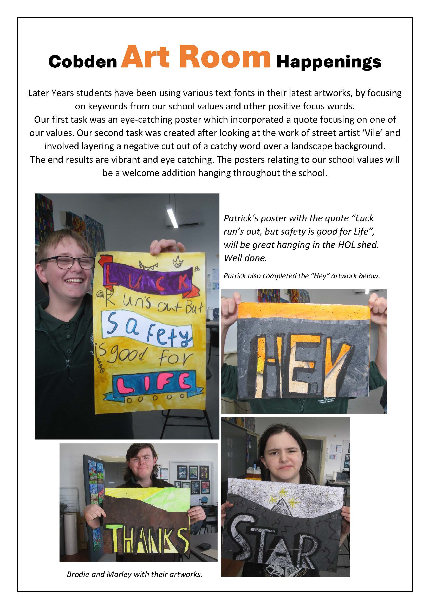 Next week our Cobden Campus students will be learning more about cyber safety, online etiquette and staying safe. They will complete a 2 week block on understanding safe use of the internet and social platforms. In week 10 we will invite families to visit the school to showcase our learning in this area.