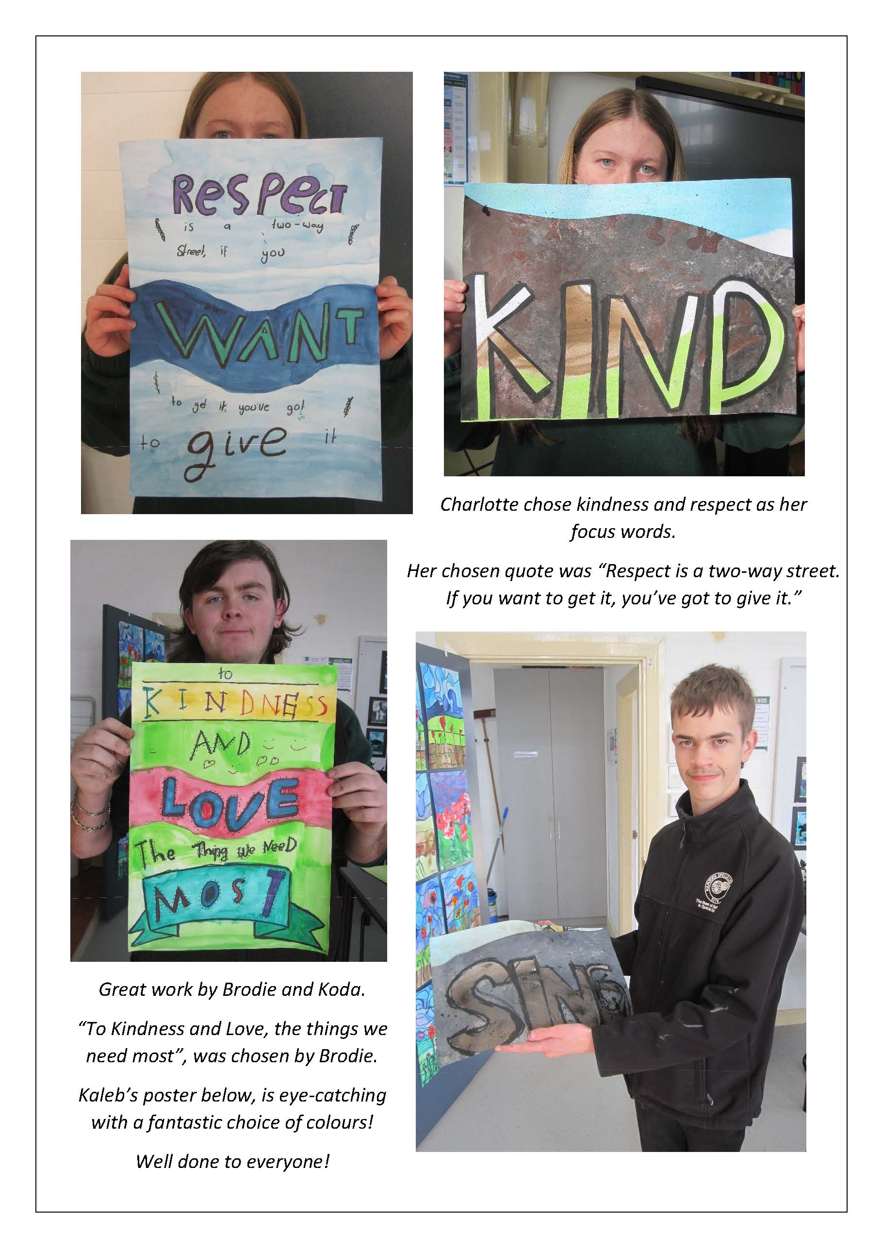 Later Years students have been using various text and fonts in their latest artworks, which incorporate the use of our school value keywords – KIND, SAFE, TEAM, RESPECT.