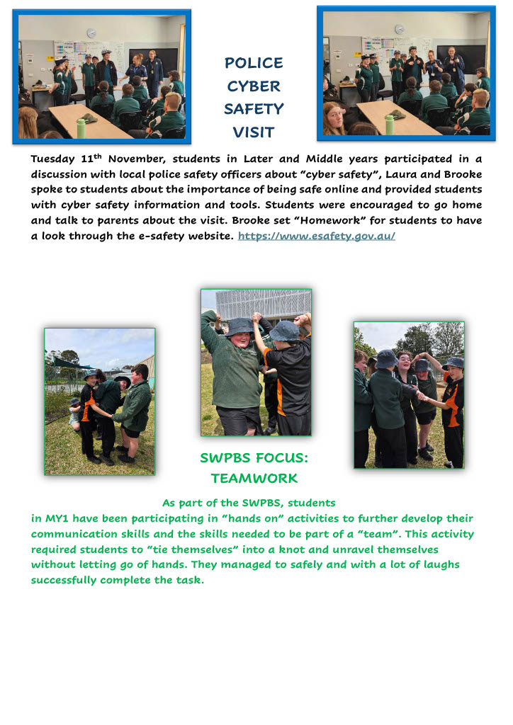 We thank the Community Police who attended both the Terang and Cobden Campuses on Tuesday. The students in years F-2 had the police visit their classrooms to see all their hard work and of course the police car with it’s lights and sirens. The students in years 3-6 learned about being safe online especially when gaming. The Cobden students also learnt about HOW to be safe online and the consequences for inappropriate behaviours. It is vital that schools, families and community continue to support our children to navigate the cyber world in a safe manner. The introduction in December of students under 16 being banned from all social media will have an impact on our students that already access these platforms, we need to support them to navigate these new laws.