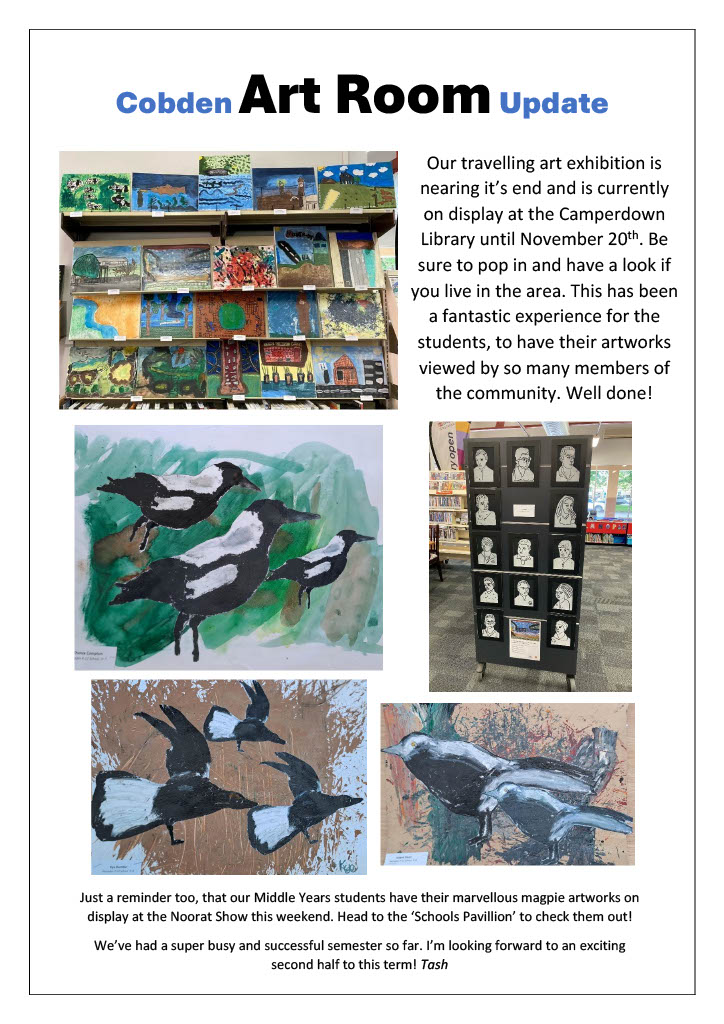 Artworks from our Middle Years students will be on display at the Noorat Show this weekend. Be sure to check them out if you head along and enjoy the day!