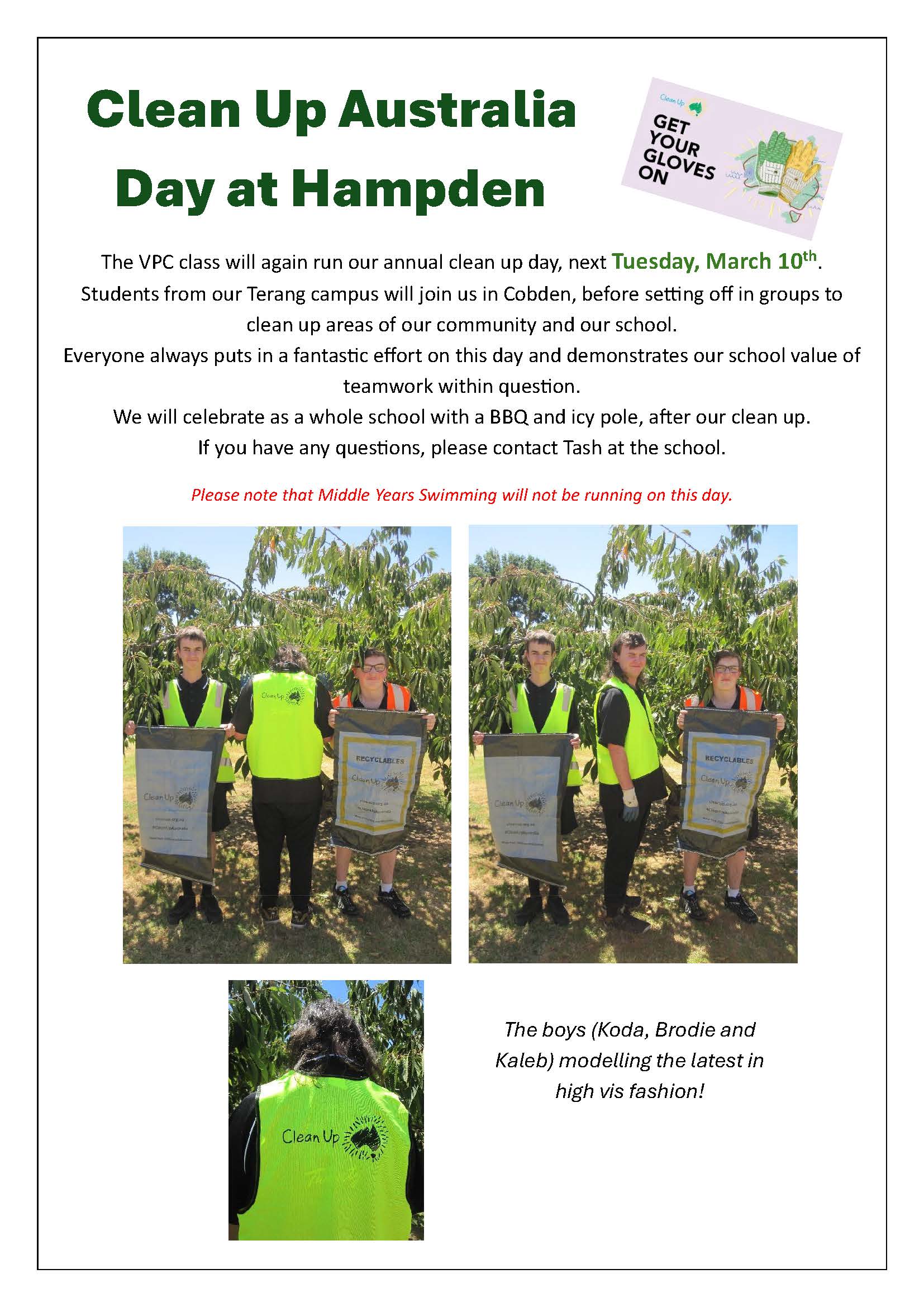 Next Tuesday our whole school will participate in Clean up Australia Day and we thank Natasha Togni for organising this event again this year. The day supports our students to understand the importance of the environment being everyone’s responsibility and how we can all contribute to keeping our community clean.